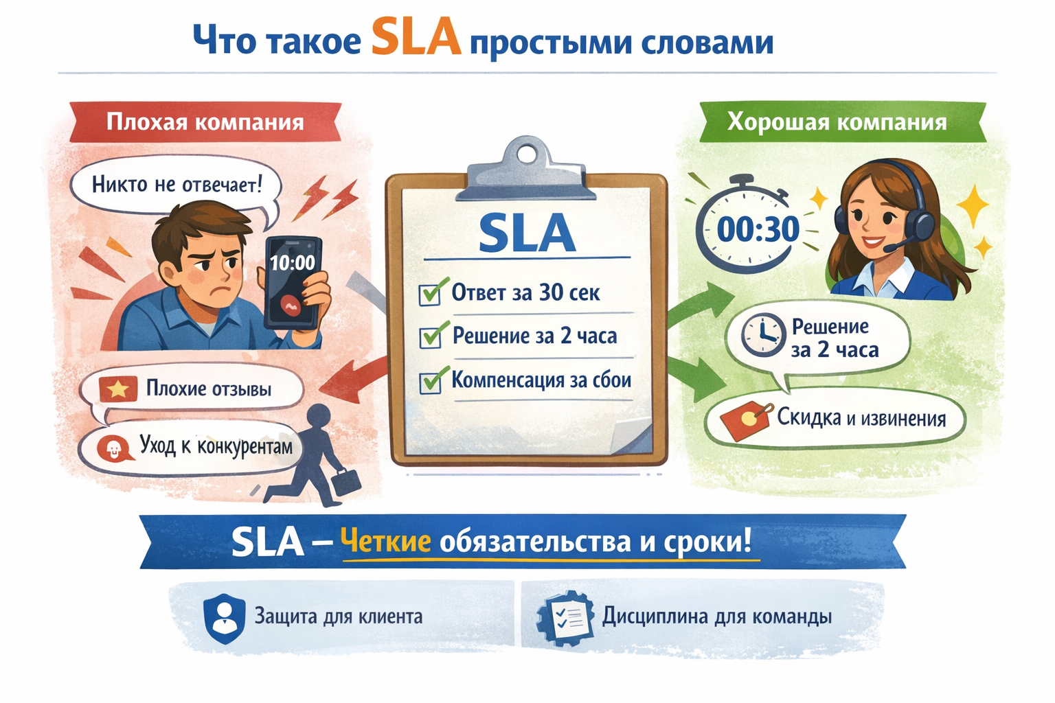 Клиент звонит в компанию и ждёт ответа. Минута, пять, десять. Никто не берёт трубку. Он злится, пишет негативный отзыв и уходит к конкурентам. В другой компании на звонок отвечают за 30 секунд, проблему решают за два часа, а если не успели — извиняются и делают скидку. Разница в подходе очевидна: во второй компании работает чёткая система обязательств. Именно для этого существует SLA — механизм, который превращает обещания «мы быстро работаем» в конкретные цифры и сроки. Это защита для клиента и дисциплина для команды. Разберёмся, что такое SLA простыми словами и зачем этот инструмент нужен в бизнесе.