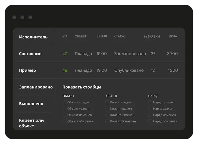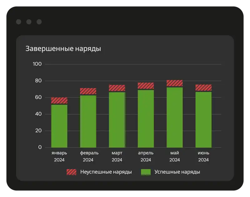 Планадо автоматически собирает статистические данные по нарядам и исполнителям. Вы можете оценить объём выполненной и запланированной работы, увидеть причины провалов и производительность сотрудников.