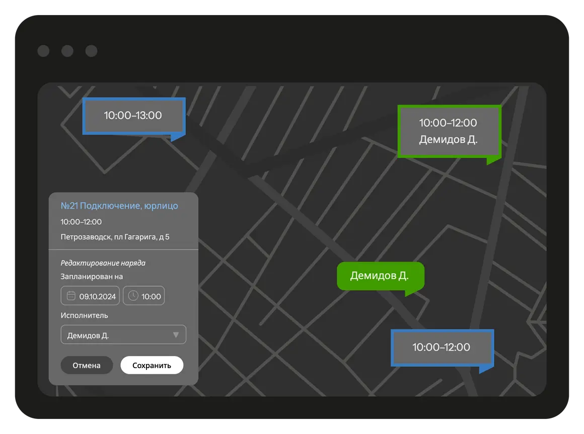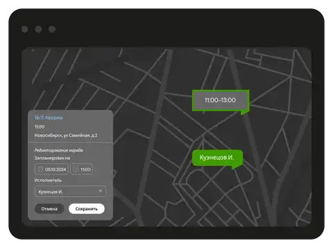 Масштаб расписания — день или неделя, в зависимости от глубины планирования. Наряд можно назначить исполнителю прямо на карте. Для подбора исполнителя настраиваются критерии: тип работ, нужные навыки или ближайший к адресу.