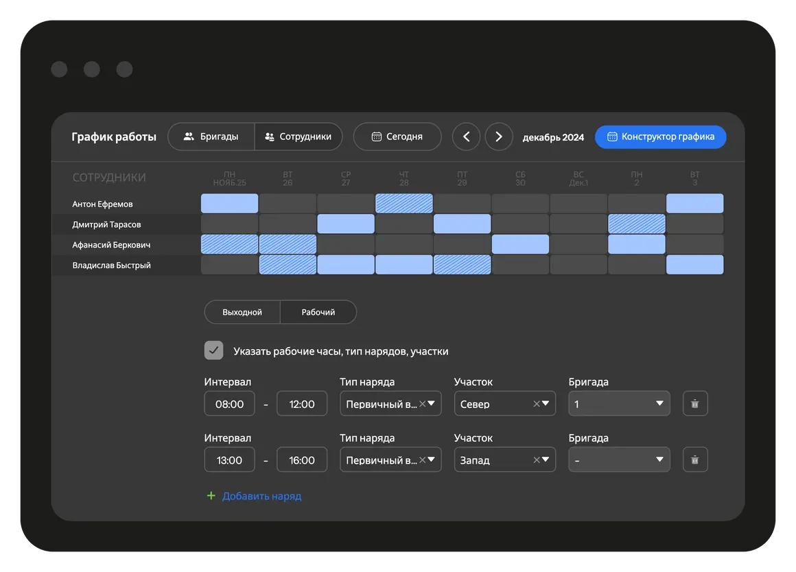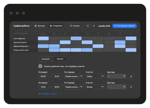 Вы можете вручную или автоматически установить график для каждого сотрудника или бригады - назначить выходные и рабочие смены, обеденный перерыв и т.д. Это упростит планирование нарядов и позволит оптимизировать назначение задач.