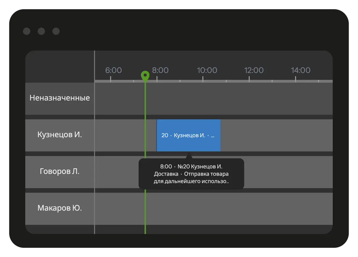Планадо поддерживает разные сценарии планирования: если клиент выбрал точную дату и время, при планировании выбирается исполнитель; если исполнитель определён заранее, наряд можно перетащить на другую дату и время в расписании.