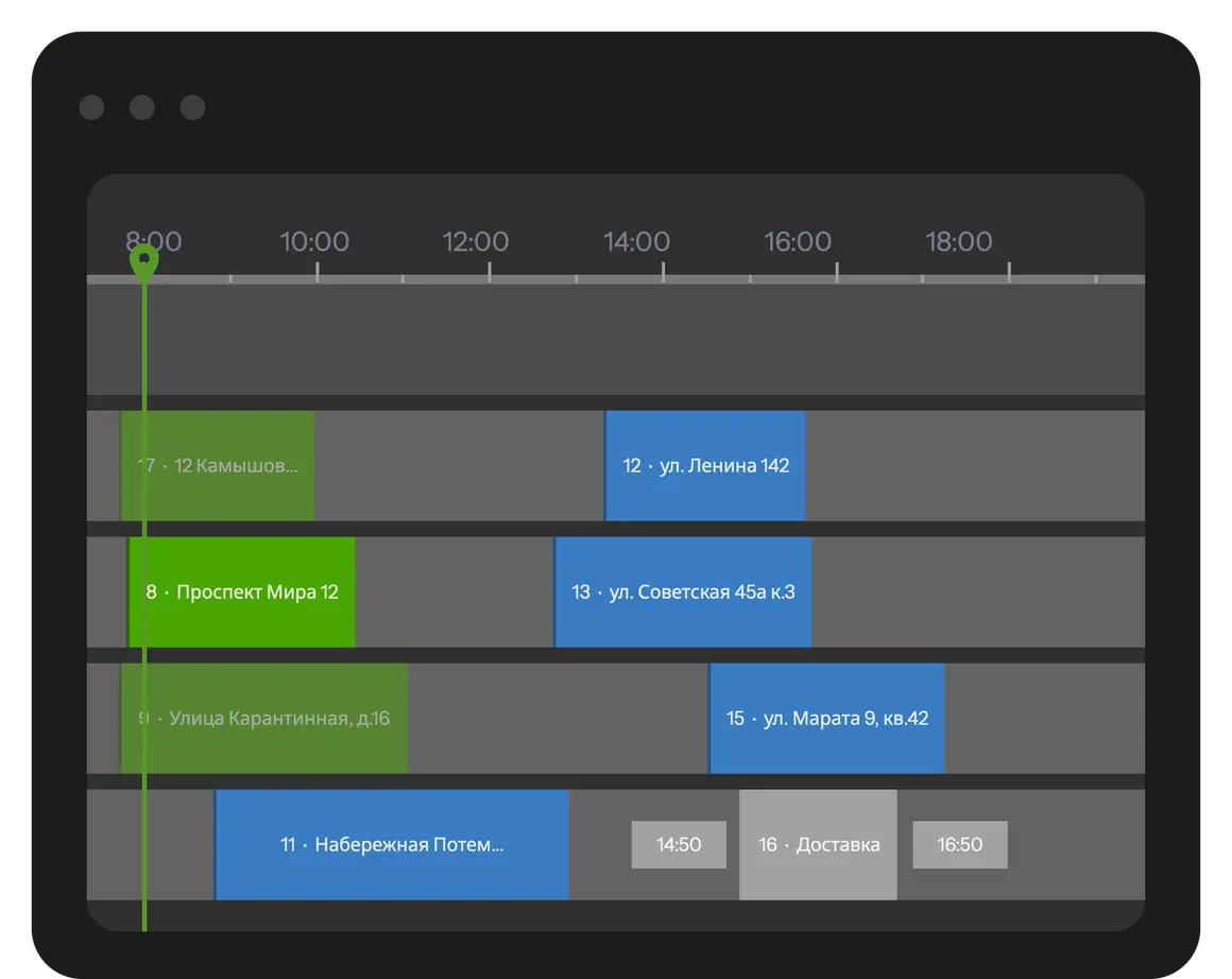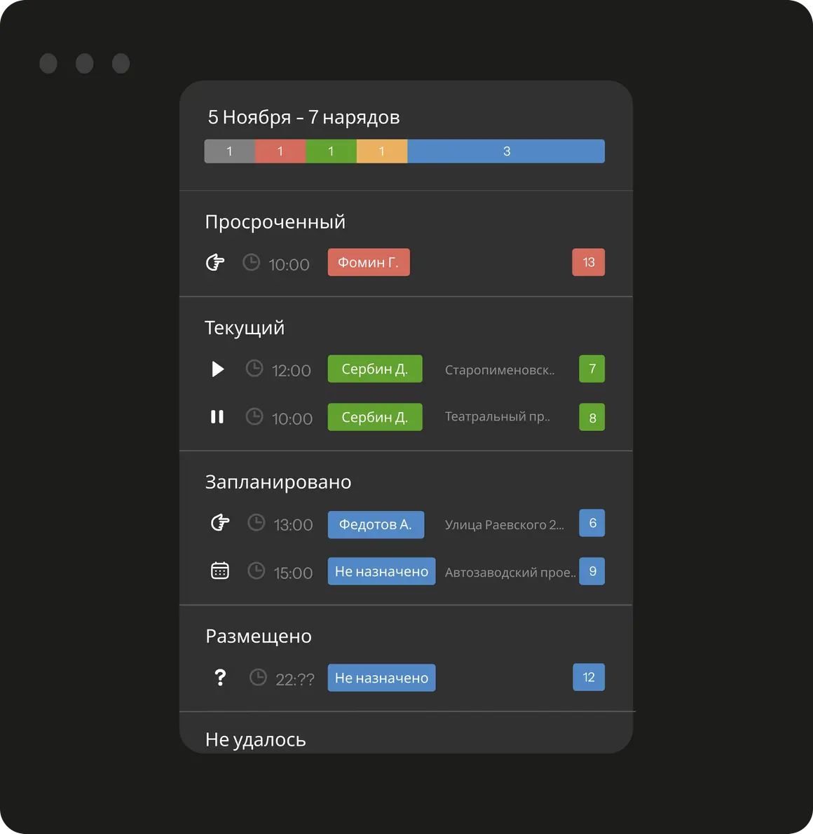 Диспетчеру в Планадо видны все этапы выполнения наряда: опубликован, в пути, начат, приостановлен, выполнен успешно и завершён неуспешно.