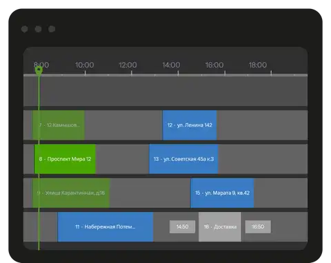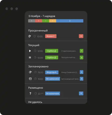 Для каждого этапа используется свой цвет, что позволяет быстро ориентироваться в статусе каждого наряда. Дополнительно, если наряд начат, но не завершён вовремя, он отмечается как затянувшийся.