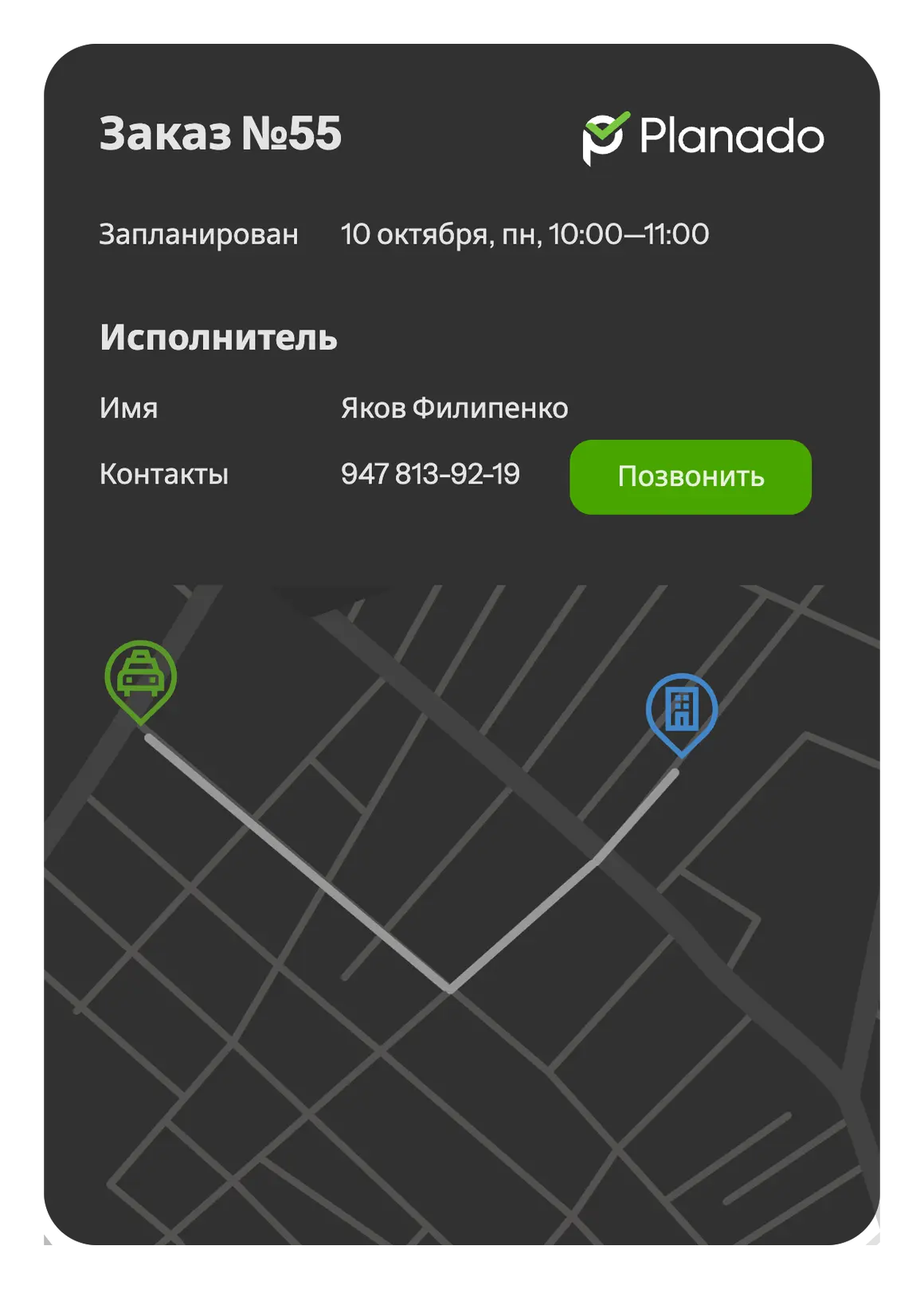 Клиенты просто переходят по полученной ссылке и сразу видят контакты, местоположение и время прибытия сотрудника. Ссылку можно отправлять автоматически.