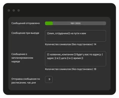 Используйте автоматические SMS- оповещения, чтобы информировать клиентов о деталях работы и маршруте движения сотрудников. После завершения наряда вы можете легко собрать отзывы клиентов и запланировать дальнейшие работы.