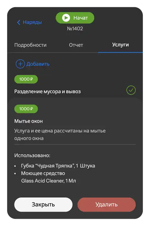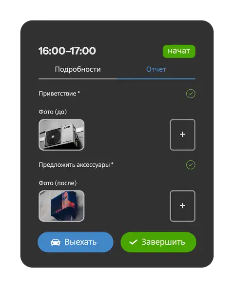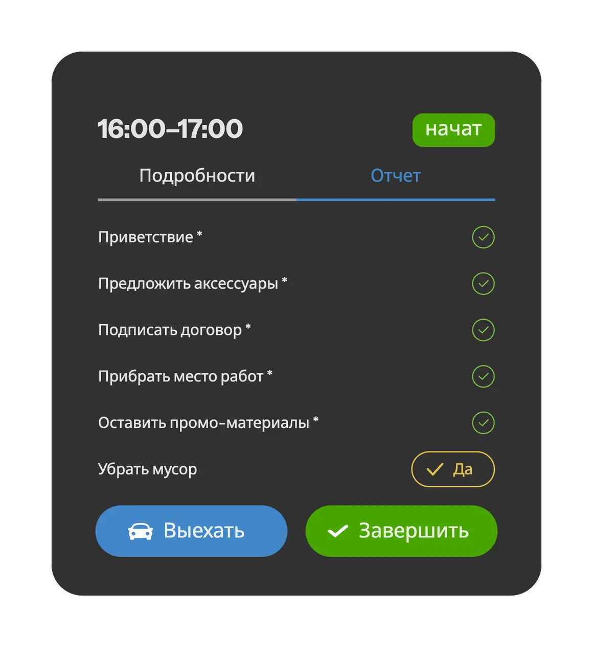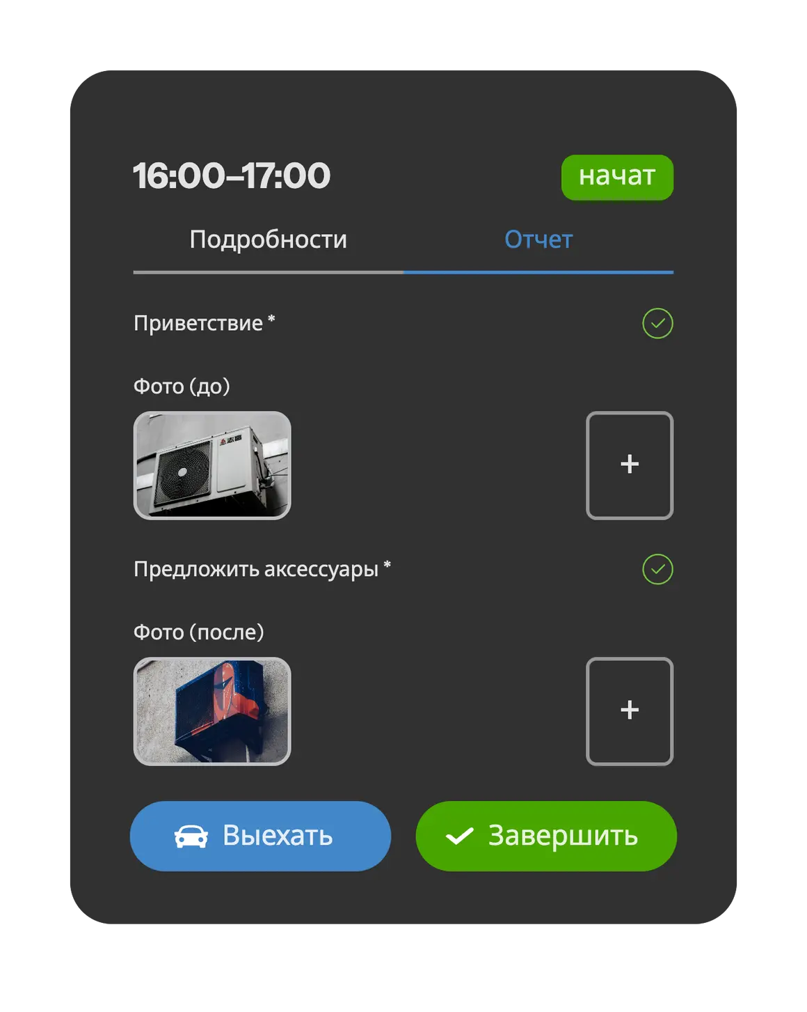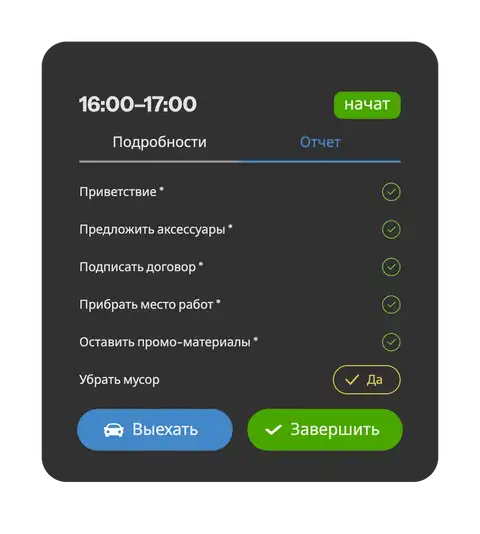 Наряд нельзя закрыть, пока не отмечены все пункты чек-листа и не заполнены обязательные поля отчёта.