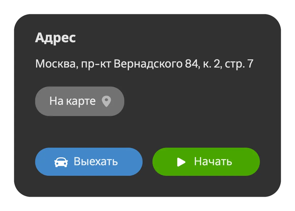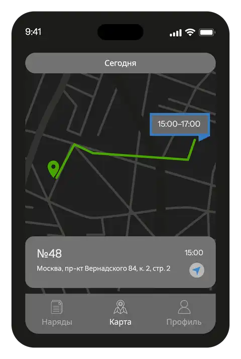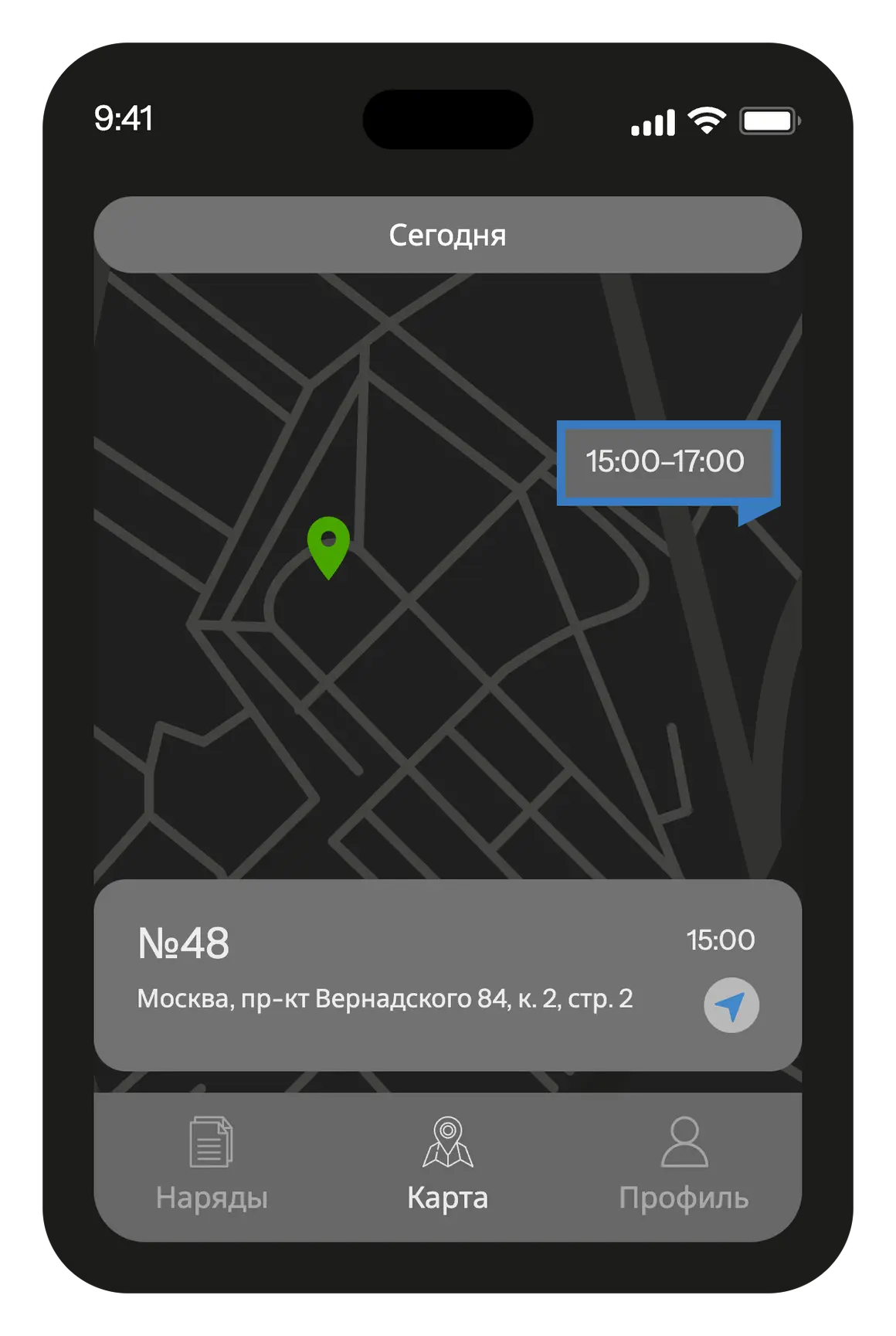 Прямо из наряда откройте карту. Адрес клиента вводить не нужно: просто нажмите иконку рядом с адресом, чтобы получить маршрут от вашего текущего положения до адреса клиента. Приложение предложит самый быстрый маршрут с учетом дорожных пробок. Из карт можно перейти в навигатор.