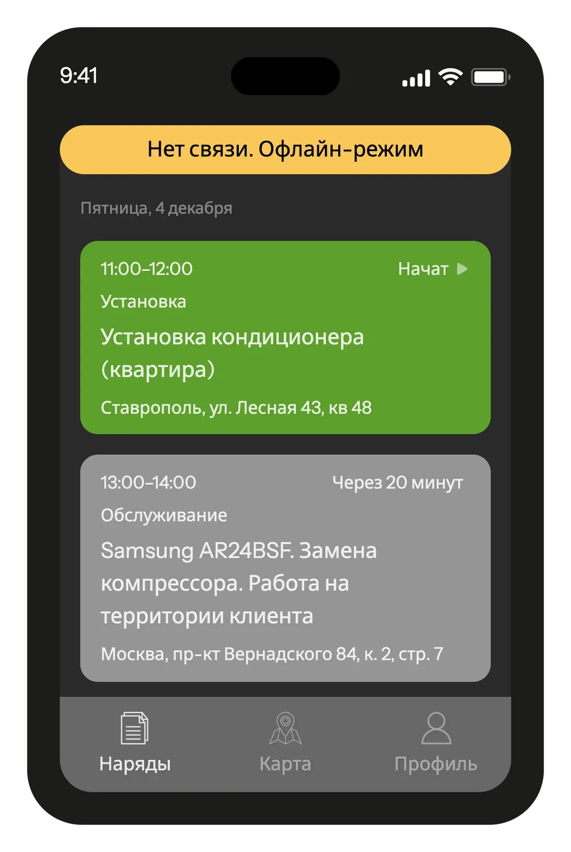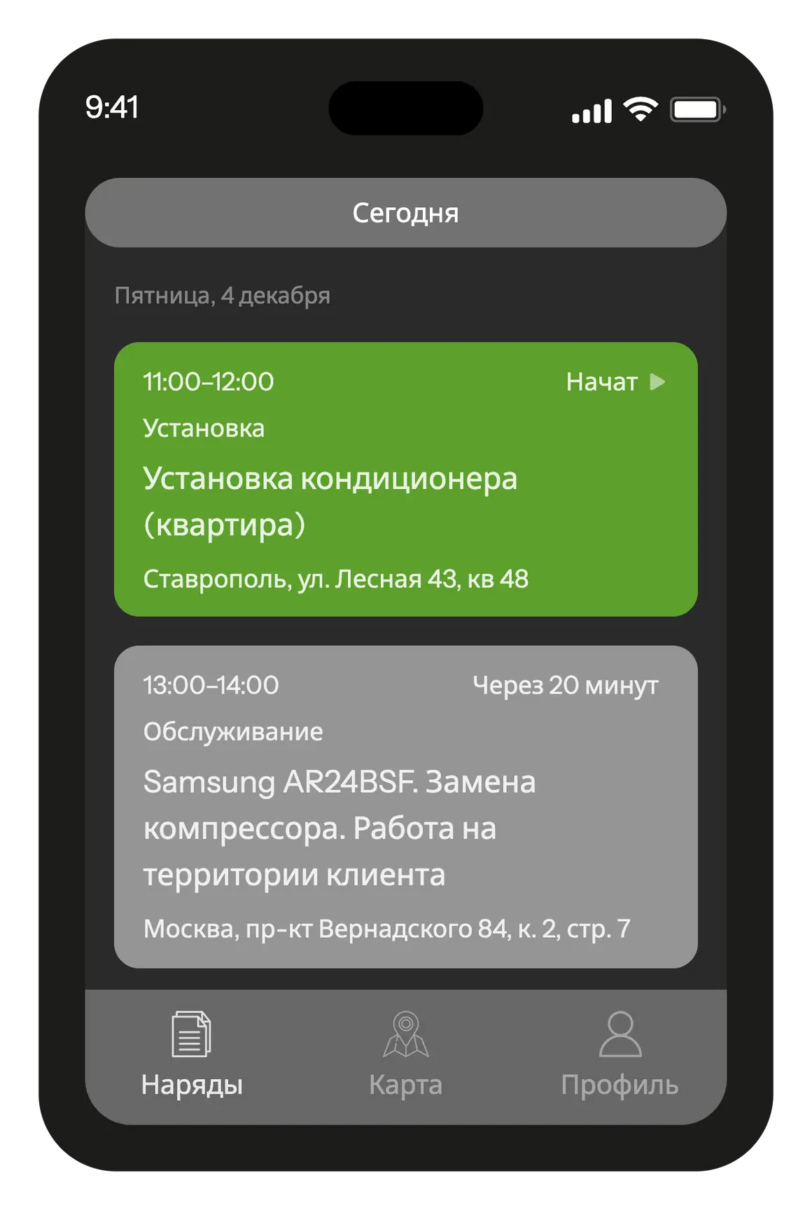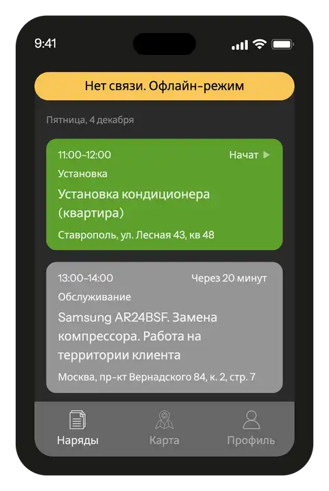 Больше не нужно заезжать или звонить в офис, чтобы узнать, какую работу нужно сегодня выполнить. План выездов доступен в мобильном приложении. Как только появляется новый наряд или изменяется запланированный, почти мгновенно придет push-уведомление, и список нарядов обновится.