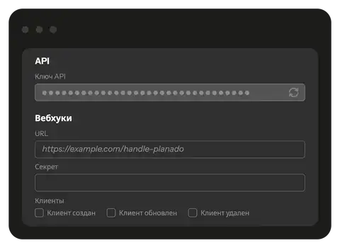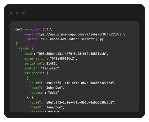 REST API и вебхуки доступны для операций с нарядами, клиентами, а также для получения данных по настройкам (например, шаблоны). Интегрируйте Планадо со своей CRM, ERP-системой, конфигурацией 1С или своей системой тикетов (HelpDesk). Смотрите документацию на API в демо-версии в меню Настройки -> Общие.