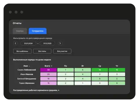На странице «Отчёты» находятся статистические данные по нарядам и исполнителям вашего Планадо. Здесь вы можете оценить объём выполненной и запланированной работы, увидеть причины провалов и производительность исполнителей.