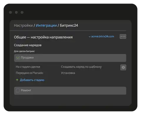 Интегрируйте Планадо с Битрикс24 или amoCRM и создавайте наряды по сделкам. Клиент автоматически переносится из CRM в Планадо. После завершения наряда сотрудником сделка будет автоматически переведена в выбранное состояние в Битрикс24.
