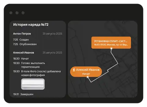 Интеграция CRM системы с мобильным приложением дает полный контроль над процессом. Работник в приложении видит всю информацию по заявке: контакты клиента, адрес, описание работ, историю предыдущих визитов.