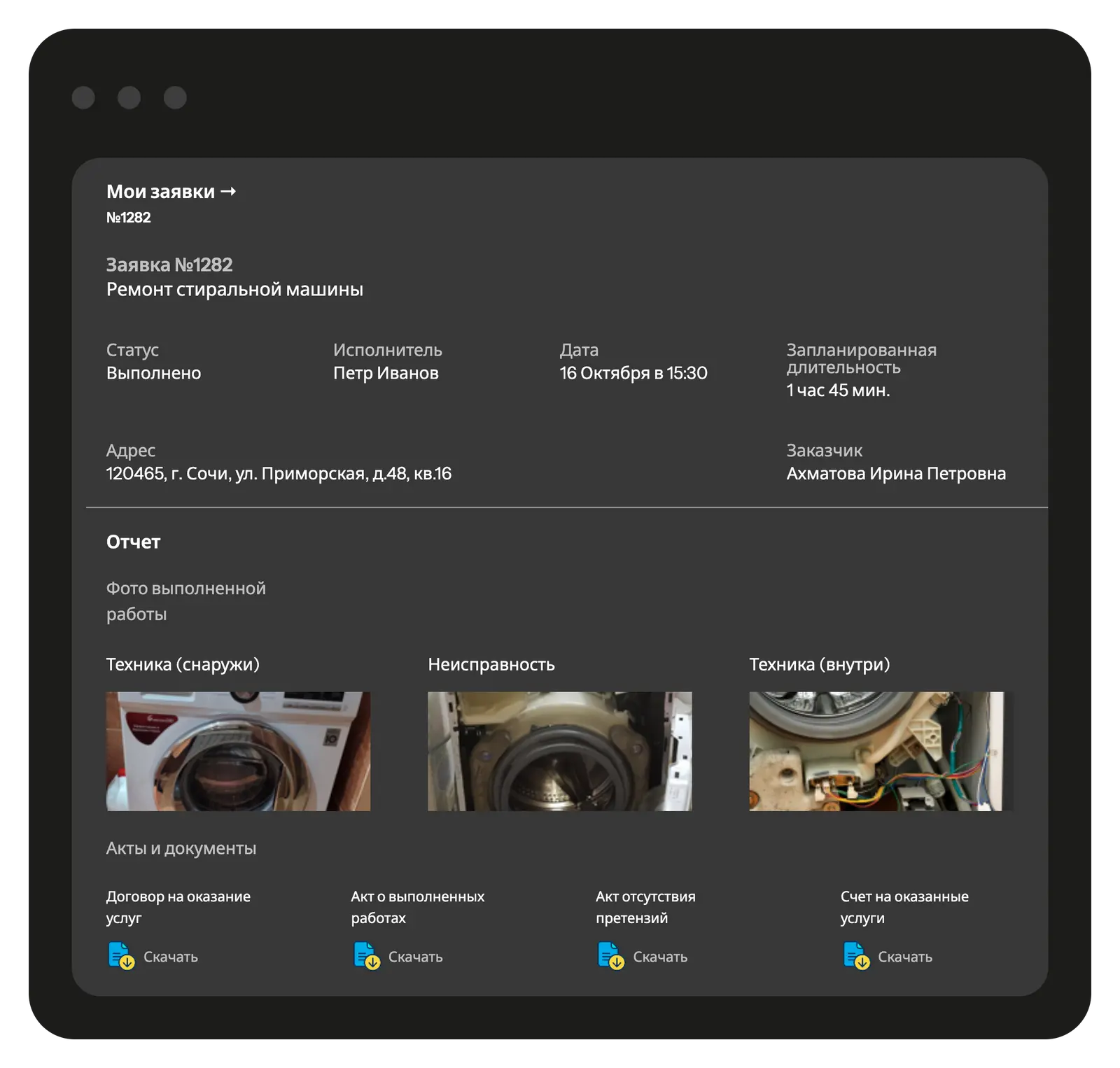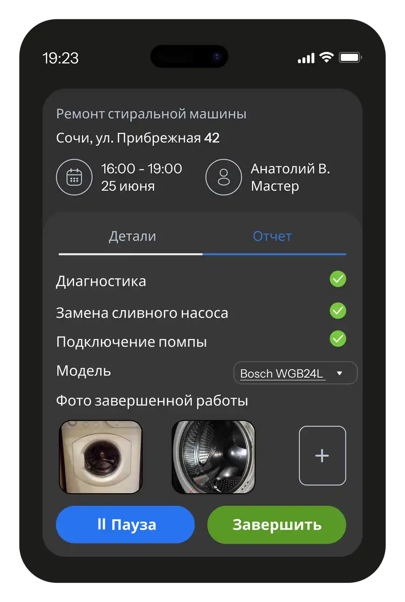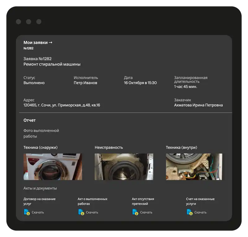 Система позволяет создавать чек-листы, собирать фотоотчёты и автоматически формировать акты выполненных работ — всё сохраняется в истории заказов.