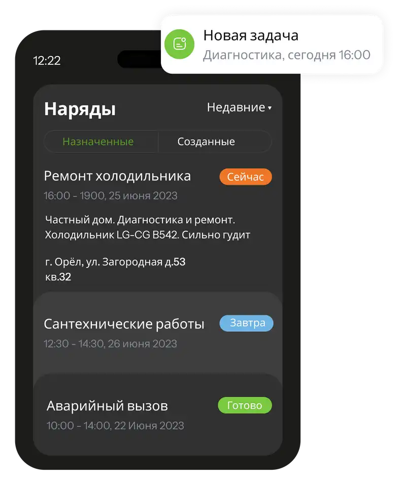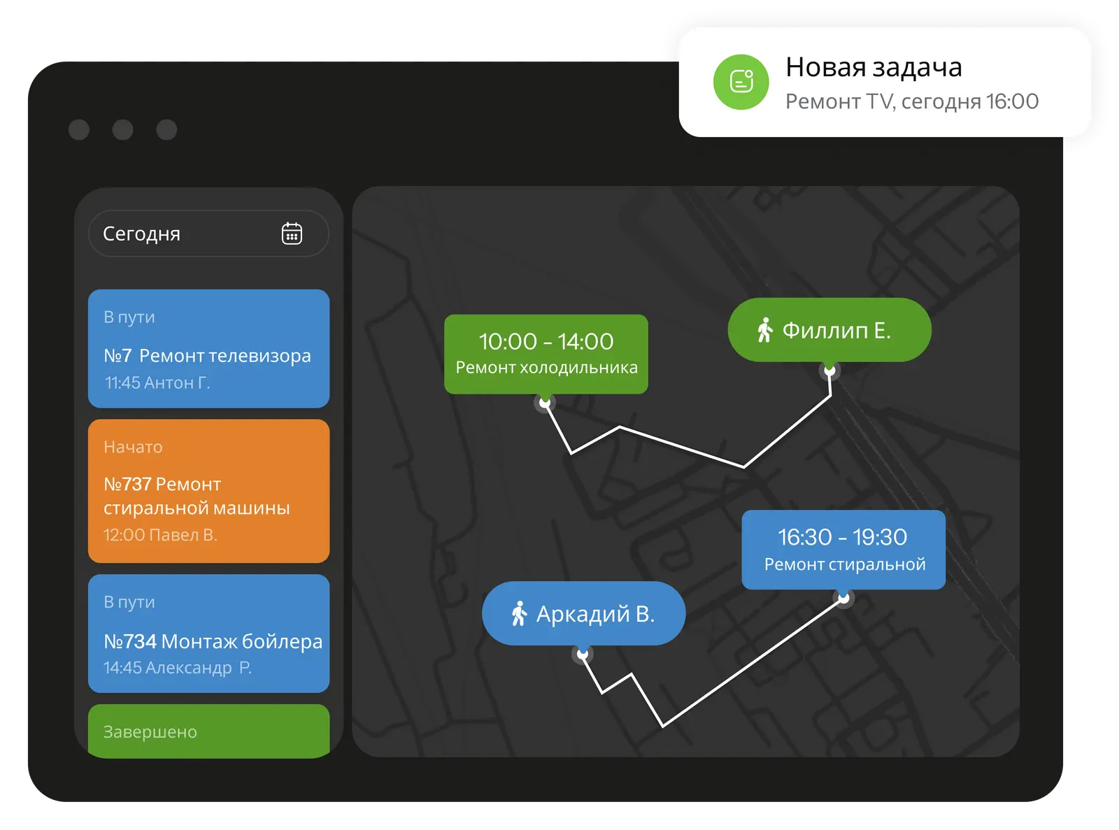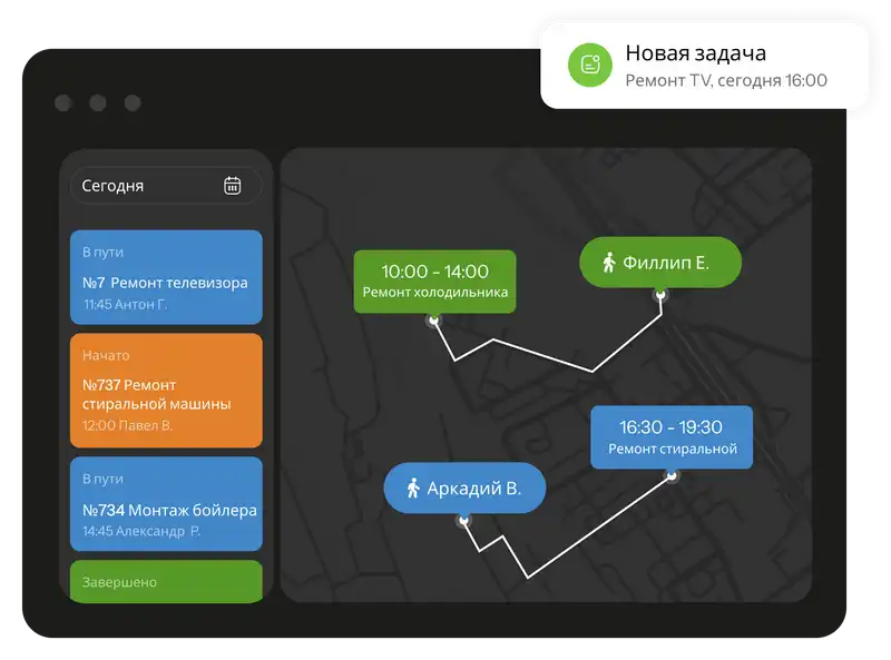 Отслеживайте местоположение выездных специалистов в рабочее время, динамически распределяйте задачи в зависимости от их близости и получите доступ к журналам работ и перемещений в любое время.