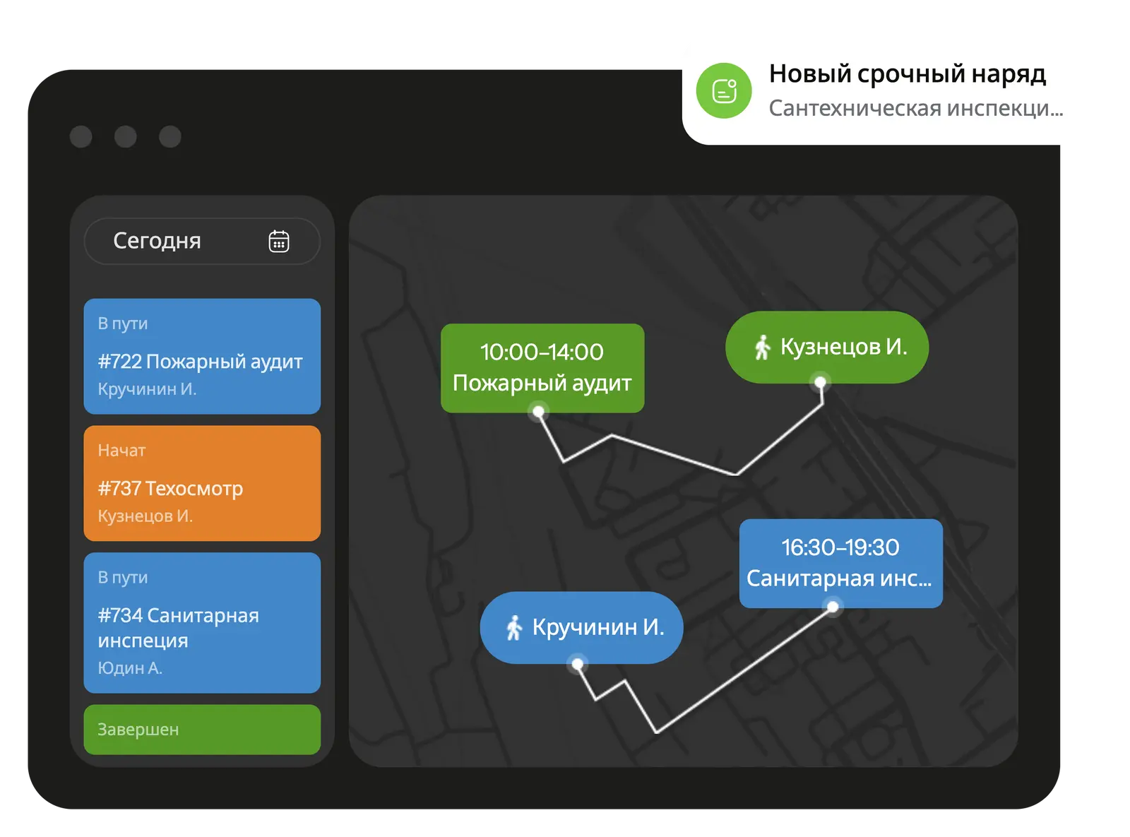 Система отслеживает перемещение аудиторов между точками проверки и фиксирует время начала и окончания работ на каждом объекте. На карте руководитель видит: