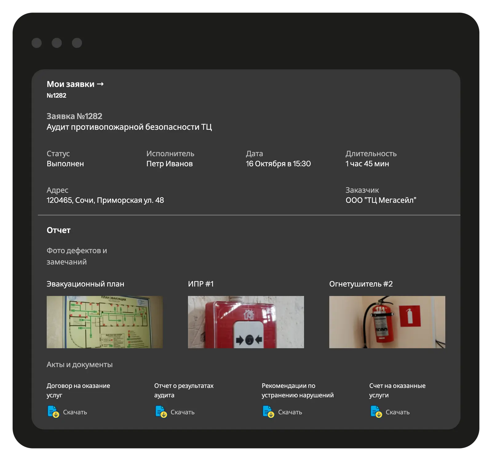 Руководитель в режиме реального времени видит статус каждого задания: назначено, в пути, выполняется, завершено. По завершении проверки данные мгновенно появляются в системе — можно сразу посмотреть результаты, фотографии и заполненные документы.