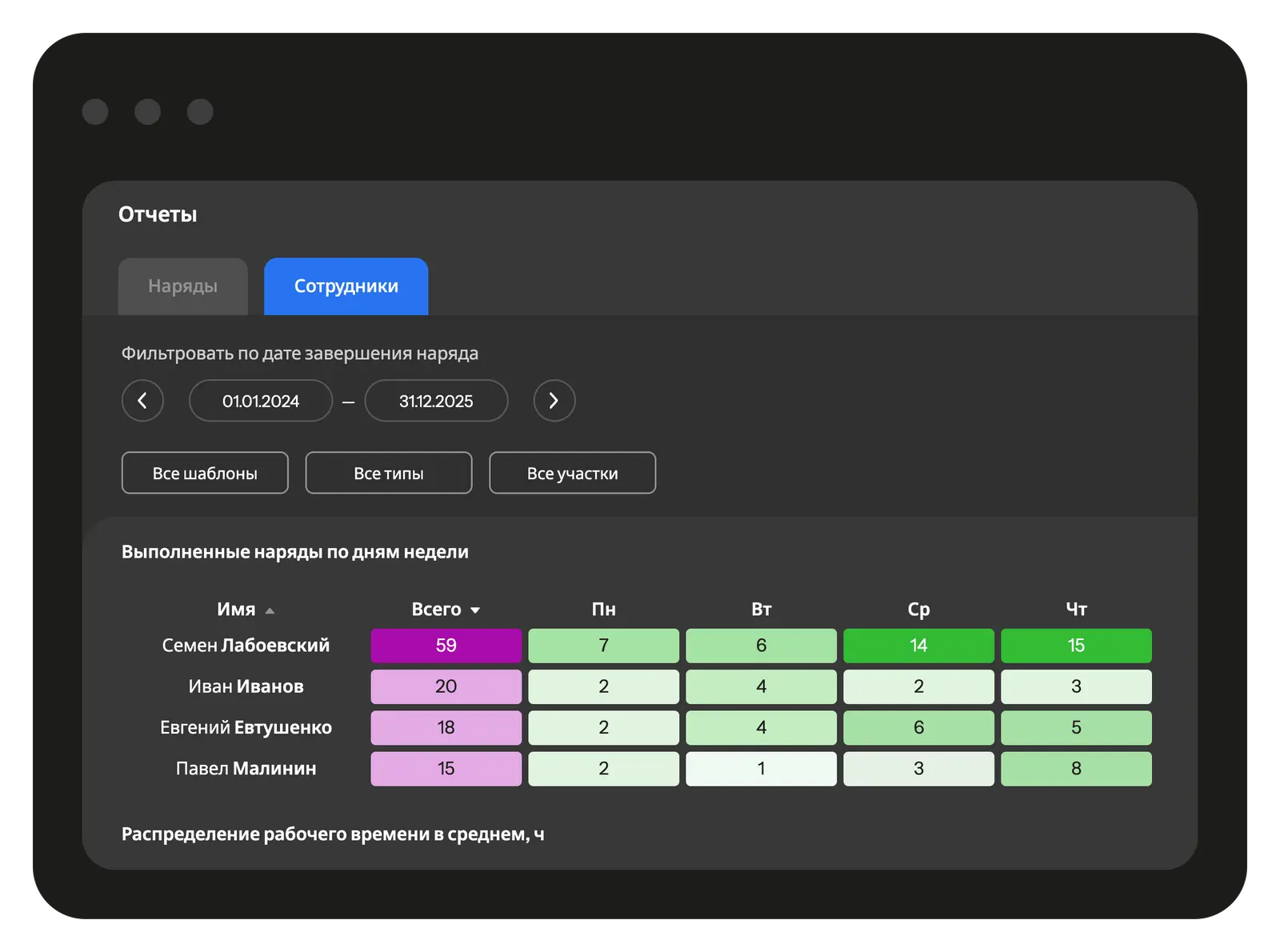 На странице «Отчёты» находятся статистические данные по нарядам и исполнителям вашего Планадо. Здесь вы можете оценить объём выполненной и запланированной работы, увидеть причины провалов и производительность исполнителей.