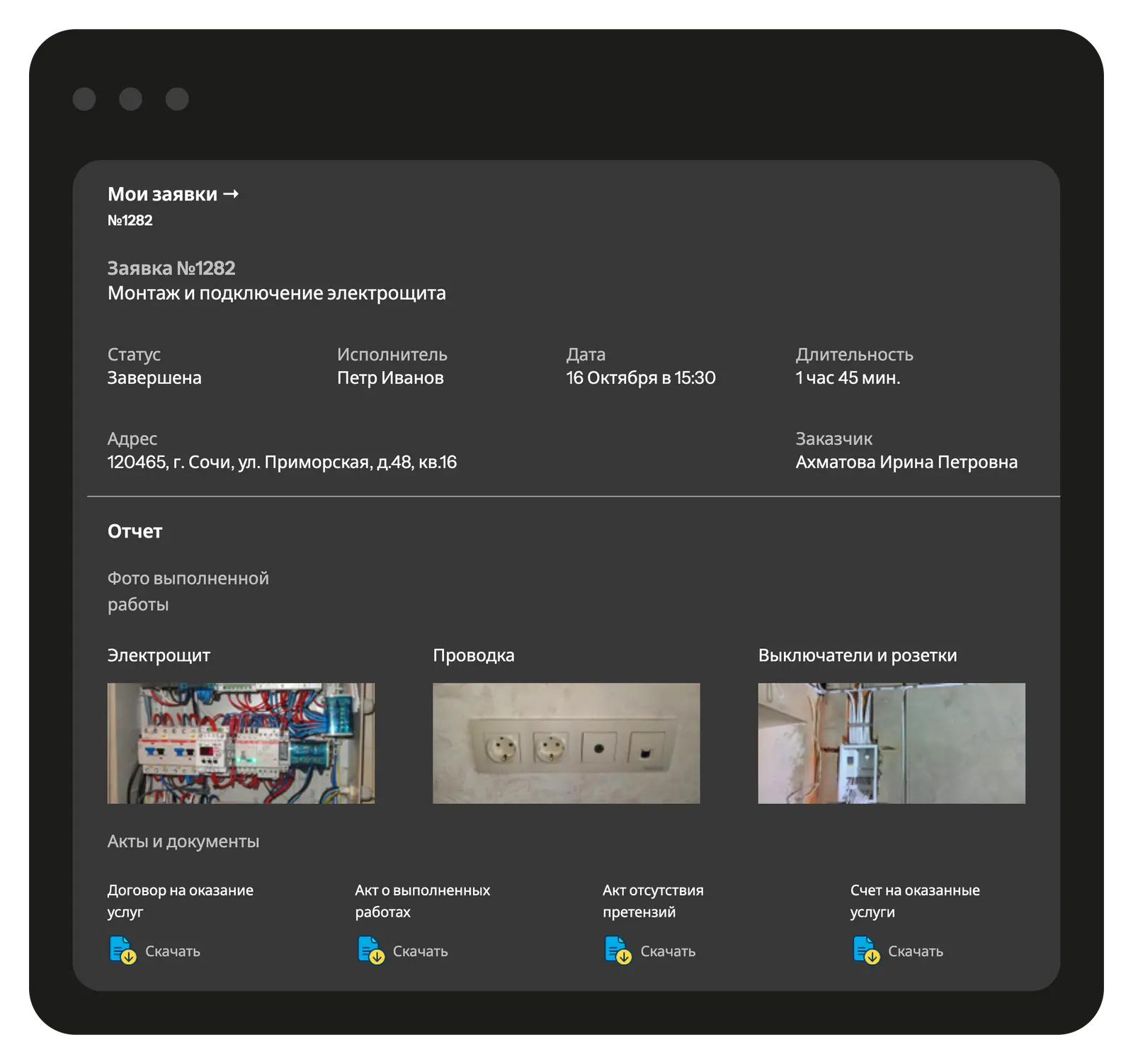 Предоставьте клиенту доступ к брендированной странице с подробной информацией о заявках, этапах выполнения работ и фотоотчётами. Через клиентский портал ваши клиенты могут отслеживать статус своих заказов, видеть завершённые и запланированные работы, а также оставлять отзывы о сервисе. Вы самостоятельно определяете, какие заявки и детали будут доступны клиенту для просмотра.