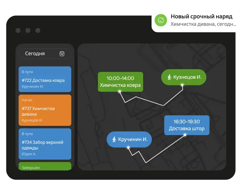 Курьерская служба химчистки получает оптимизированные маршруты для забора и доставки заказов. В мобильном приложении отображается последовательность адресов, контакты клиентов и особые указания по каждому заказу. GPS-трекинг показывает текущее местоположение курьеров и помогает назначить ближайшего сотрудника для срочного вызова.