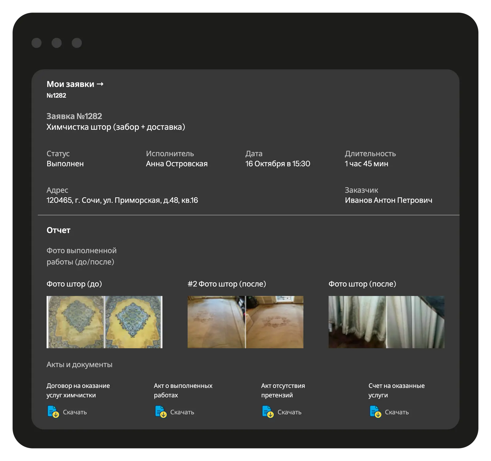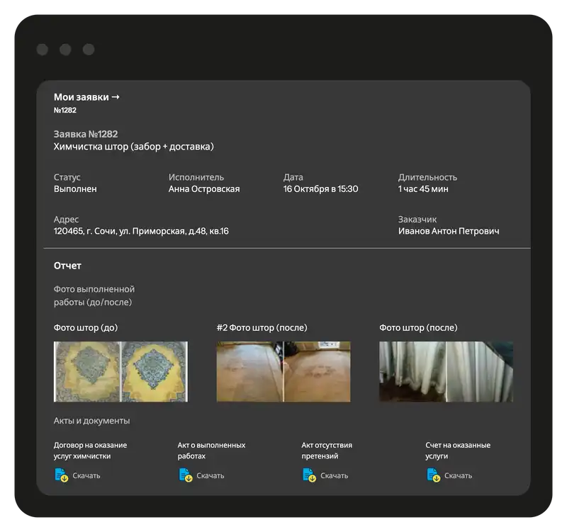 Предоставьте клиенту доступ к брендированной странице с полной информацией о заказах на выездную химчистку или стирку, этапах выполнения работ, статусе доставки и истории всех обращений.