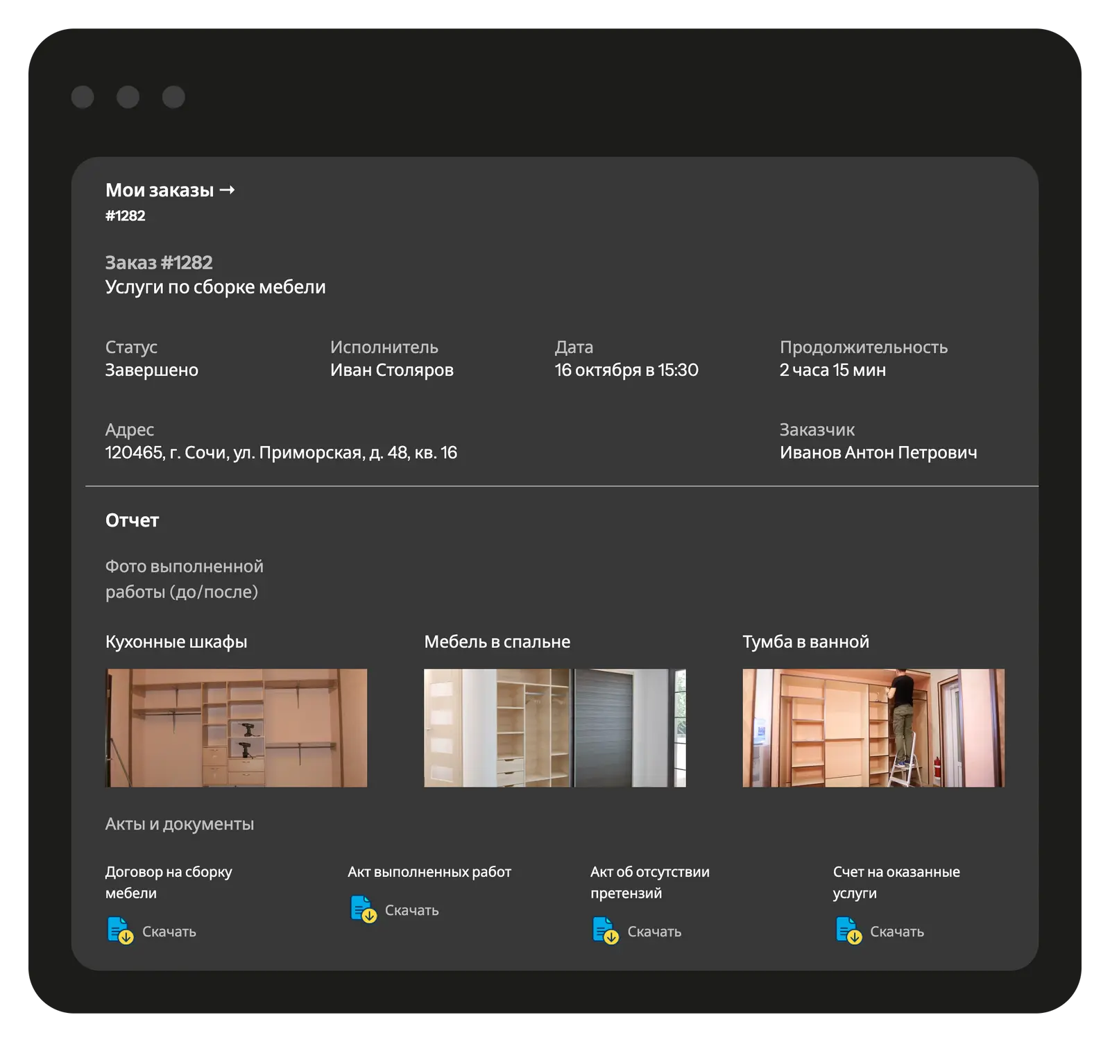 Предоставьте клиенту доступ к брендированной странице с полной информацией о заявках на ремонт и сборку мебели, этапах работ, фотоотчётами и сопроводительной документацией.
