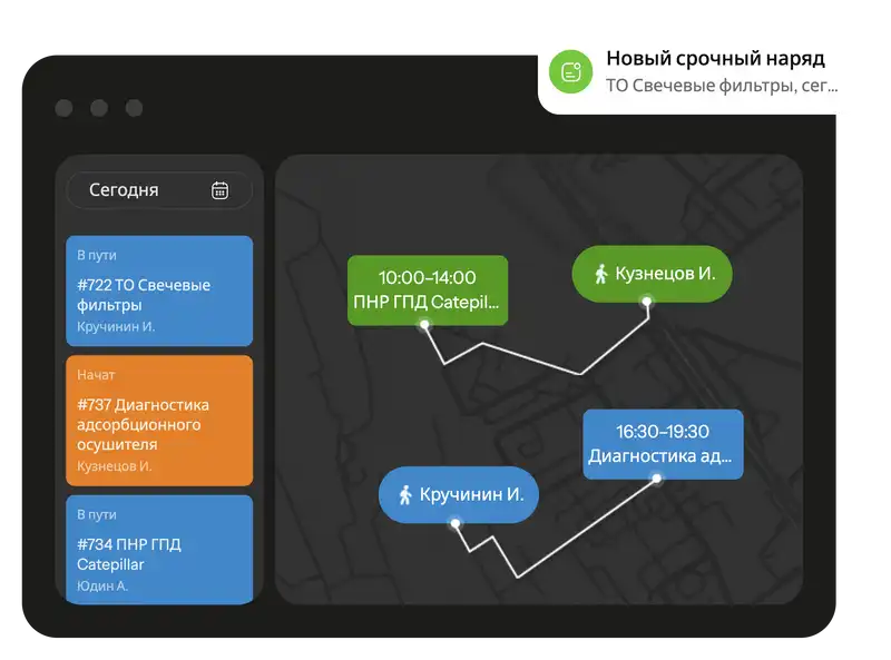 Отслеживайте местоположение выездных специалистов в рабочее время, динамически распределяйте задачи в зависимости от их близости и получите доступ к журналам работ и перемещений в любое время.
