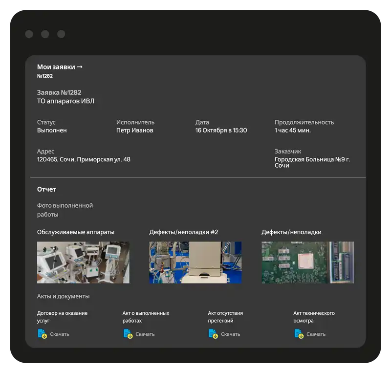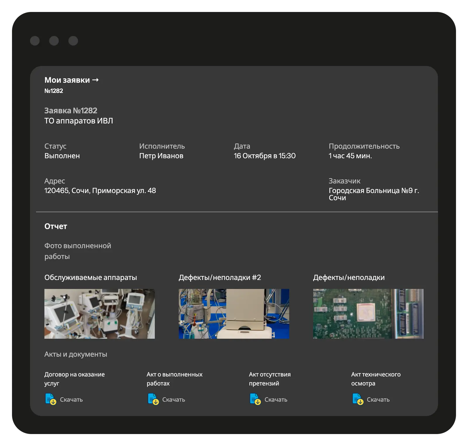 Клиенты получают доступ к порталу, где могут отслеживать статусы заявок и историю обслуживания своего медицинского оборудования. Это делает взаимодействие между компанией и заказчиком более прозрачным и удобным. Заказчик может отправить заявку прямо из системы и получить мгновенное подтверждение.