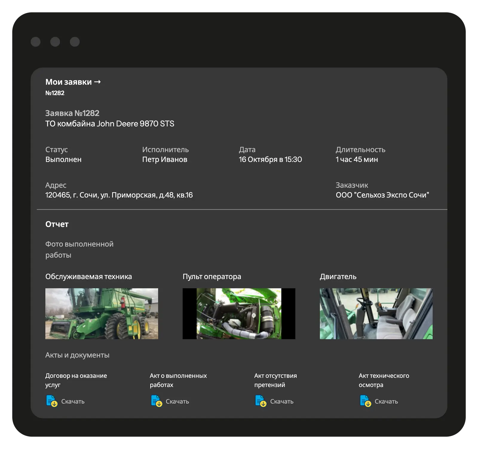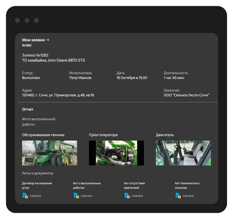 Все документы и акты формируются и хранятся в системе, доступ к ним есть у сотрудников и руководителей. История обслуживания техники всегда под рукой.