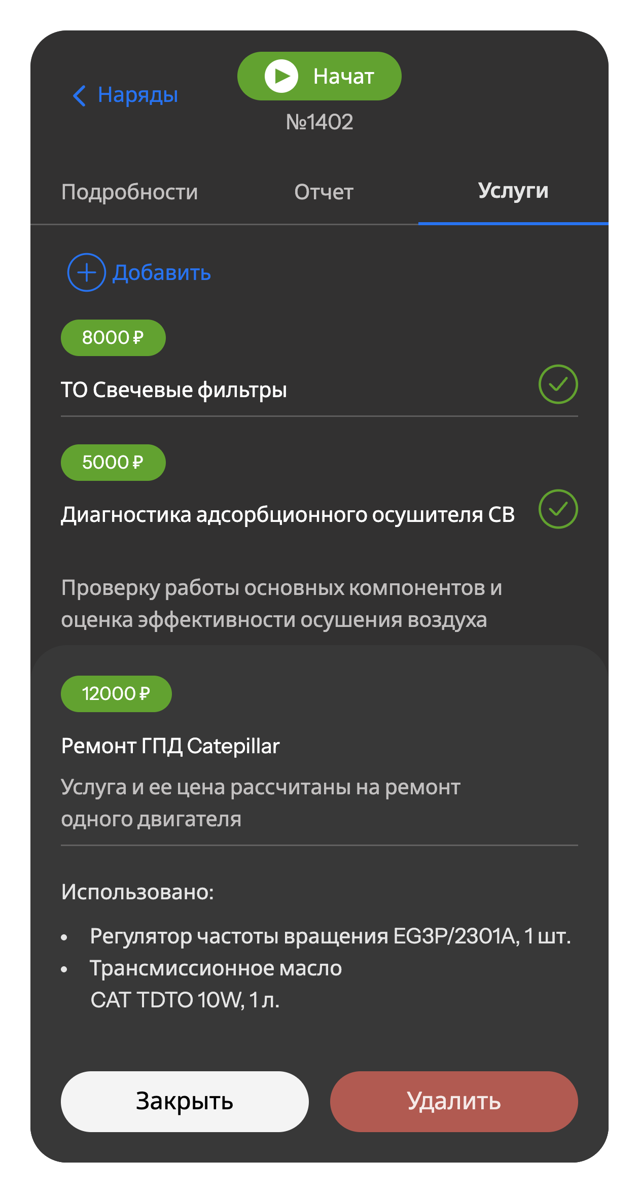 Сотрудник отмечает в мобильном приложении все выполненные работы и затраченные материалы, которые сохраняются в отчете и автоматически передаются в офис и на склаж.