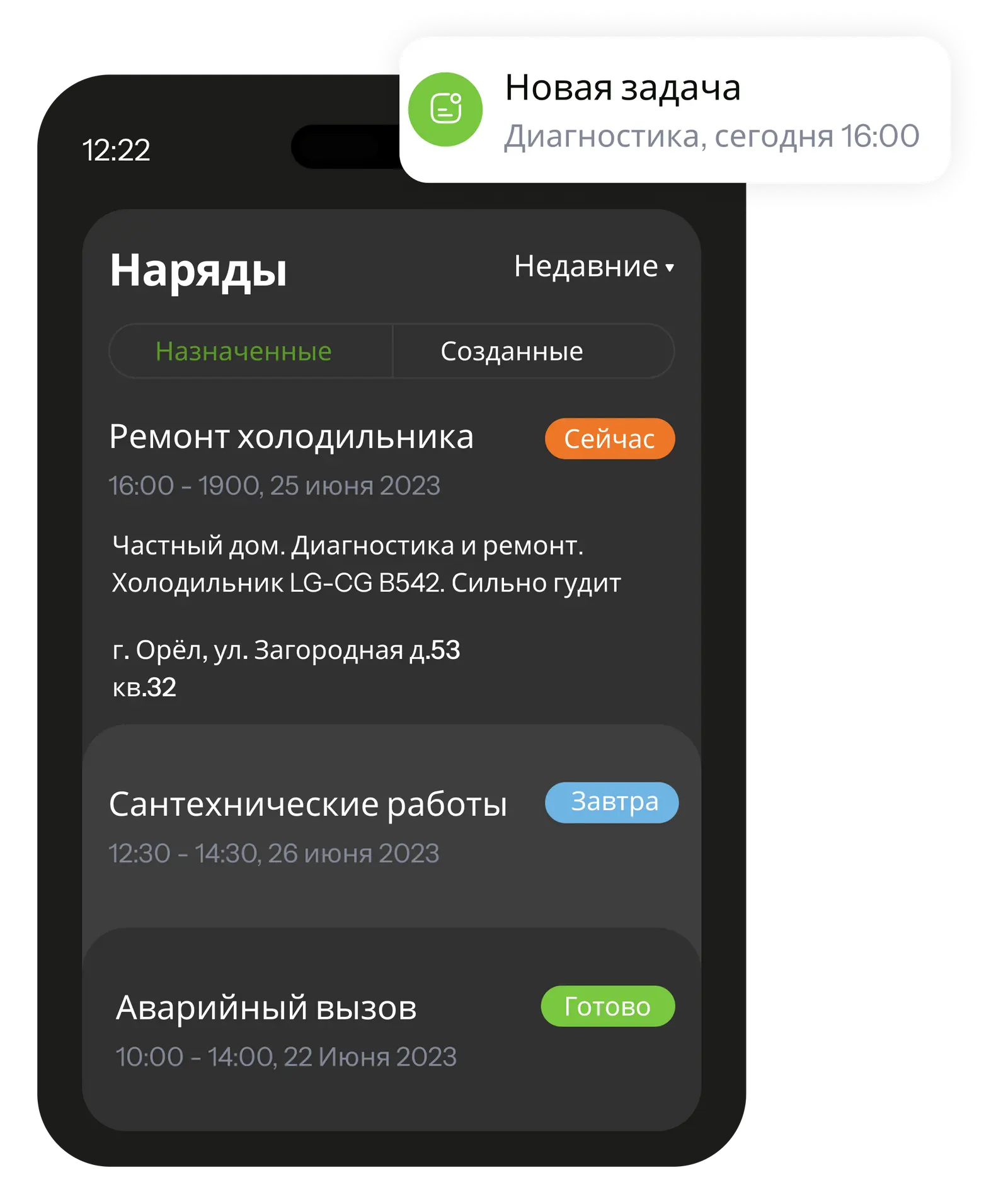 Настройте распределение задач между выездными специалистами по зонам, навыкам или графику.