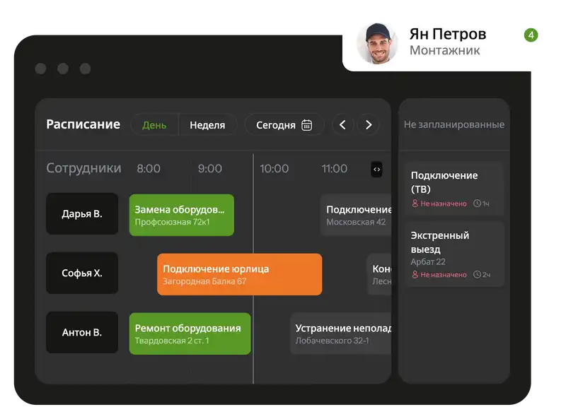 Планадо распределяет заявки между монтажниками, учитывая их загрузку, специализацию и местоположение, что позволяет минимизировать простои и увеличить количество выполненных подключений.