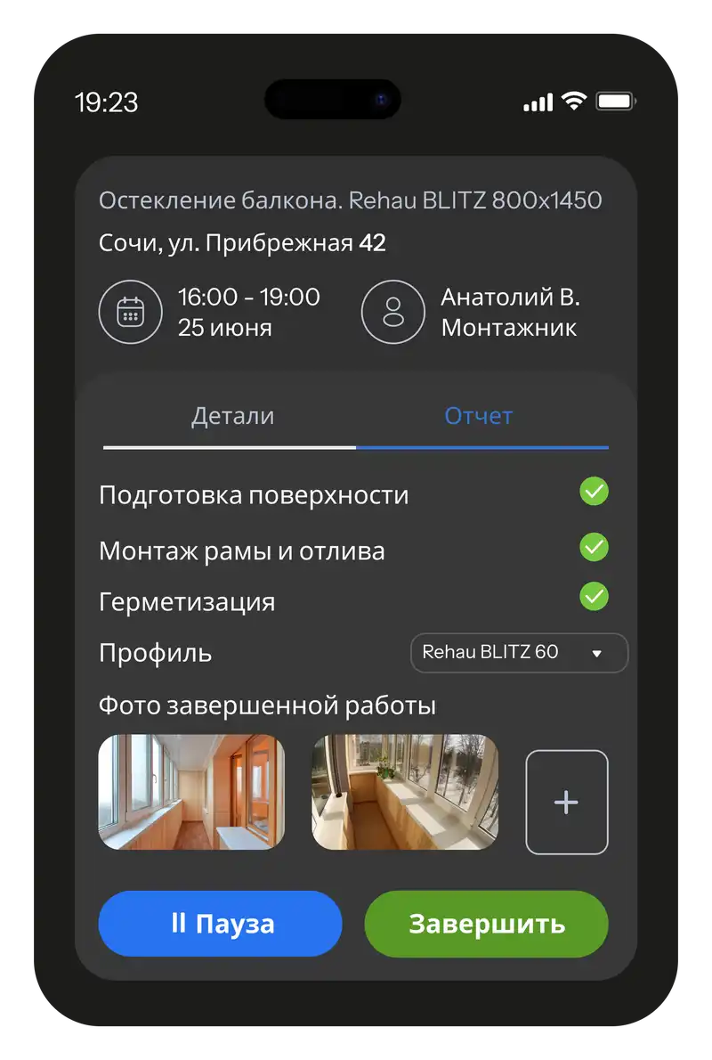 Мобильное приложение Планадо существенно упрощает работу выездных специалистов. Замерщики и монтажники могут оперативно получать информацию о новых заданиях, просматривать детали заказа и историю взаимодействия с клиентом. После выполнения работ сотрудник заполняет структурированный отчет прямо на месте, прикладывая фотографии и необходимые документы. Система автоматически сохраняет все данные и делает их доступными для офиса в режиме реального времени.