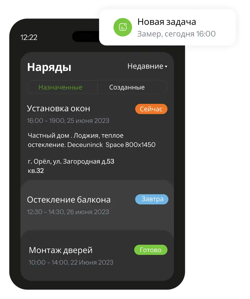 Ваши замерщики и монтажники получают все запланированные работы и изменения через мобильное приложение, а также уведомления о новых заданиях.