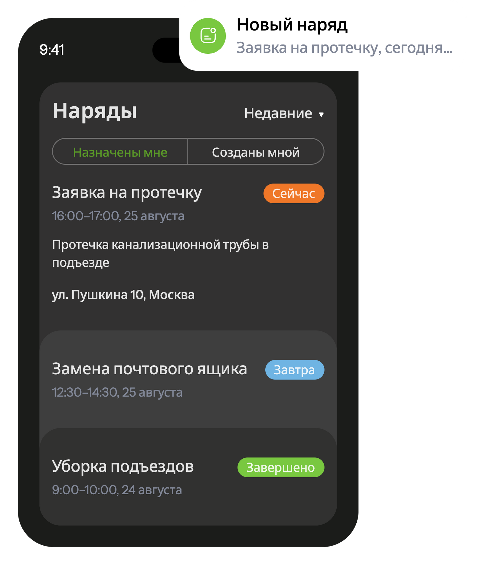 Диспетчер видит местоположение всех сотрудников на карте в реальном времени. При поступлении срочной заявки система подбирает ближайшего свободного специалиста с нужными навыками. Выездные работники получают наряды в мобильном приложении с адресом, описанием работ и контактами заявителя.